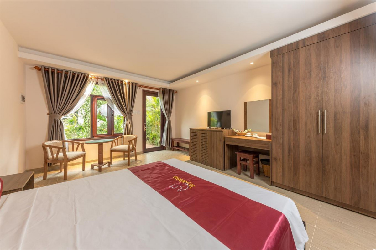 Vip bungalow - double — 30 кв. м, спальня, двуспальная кровать, ванная комната, душ, терраса, вид на сад.